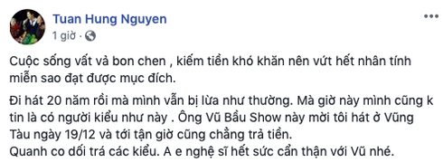 Trên trang cá nhân, nam ca sĩ Tuấn Hưng vừa bày tỏ sự bức xúc khi bị một bầu show mời đi hát từ cuối năm 2019 nhưng đến hiện tại vẫn không trả cát - xê. Chủ nhân bản hit "Nắm lấy tay anh" cho hay anh nhận show của "ông bầu" này ở Vũng Tàu vào ngày 19/12/2019 nhưng đến tận bây giờ kì kèo mãi không trả tiền. Tuấn Hưng đưa ra lời cảnh tỉnh cho các nghệ sĩ khác hãy tranh xa bầu show này ra để tránh bị như mình.