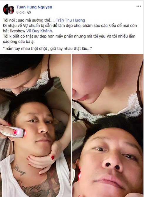 Chưa dừng lại ở đó, Tuấn Hưng còn chia sẻ thêm hình ảnh được bà xã chăm sóc da mặt. "Sao mà sướng thế. Đi nhậu về vợ chuẩn bị sẵn đồ làm đẹp cho, chăm sóc các kiểu để đi diễn. Tôi không biết có thực sự đẹp hơn mấy phần nhưng mà tôi yêu vợ tôi nhiều lắm các ông các bà ạ. Nắm tay nhau thật chặt, giữ tay nhau thật lâu" - Tuấn Hưng viết.