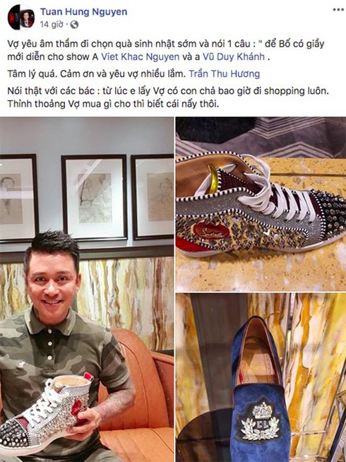 Trên trang cá nhân, Tuấn Hưng vừa khoe loạt giày hiệu và cho biết: "Vợ yêu âm thầm đi chọn quà sinh nhật sớm và nói một câu: "Để bố có giày mới diễn cho show anh Khắc Việt và Vũ Duy Khánh". Tâm lý quá. Cảm ơn và yêu vợ nhiều lắm.