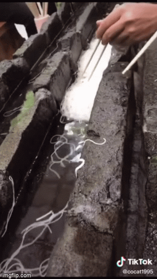 Trên mạng xã hội TikTok mới đây đã xuất hiện một món bún với cách phục vụ gần giống món ăn nổi tiếng trên, tuy nhiên thay bằng ống tre, thì cửa hàng thả trôi những phần bún vào một rãnh nước bằng đá.