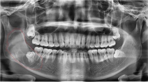 Bác sĩ Nguyễn Thanh Thái, Trưởng khoa Phẫu thuật tạo hình hàm mặt, cho biết kết quả chụp X-quang cho thấy bệnh nhân bị nang răng sừng hóa (còn gọi nang răng sinh sừng). Nang rất lớn, phát triển từ răng số 7 lan lên tới tận xương hàm trên.