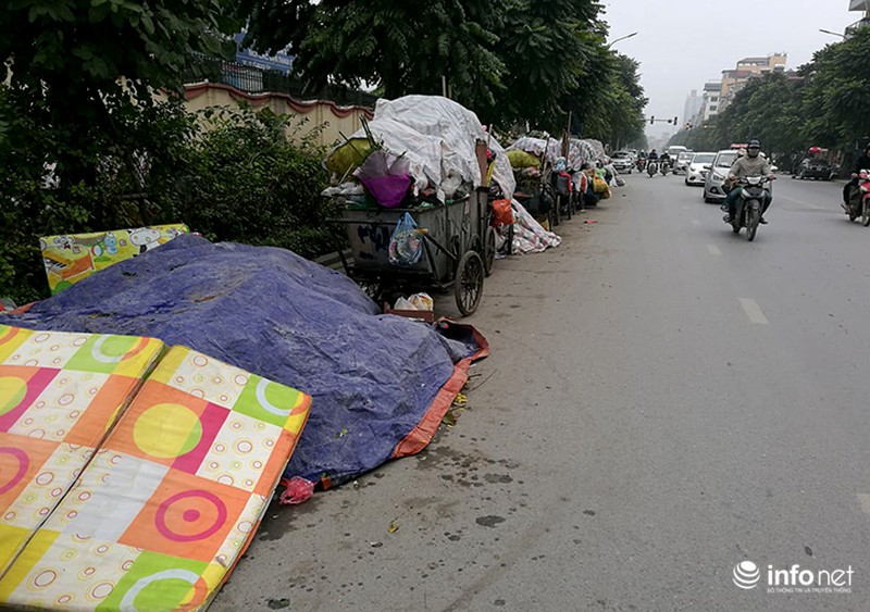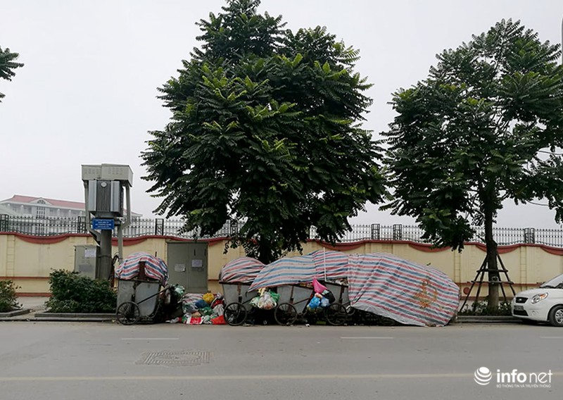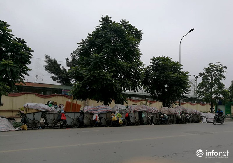 Tại nhiều điểm tập kết rác, hàng chục xe rác xếp đầy dưới lòng đường đang đợi để chuyển đi. |