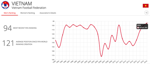 Đội tuyển Việt Nam kết thúc năm 2019 ở vị trí thứ 94 trên BXH FIFA, cao nhất trong lịch sử. Ảnh: FIFA. |