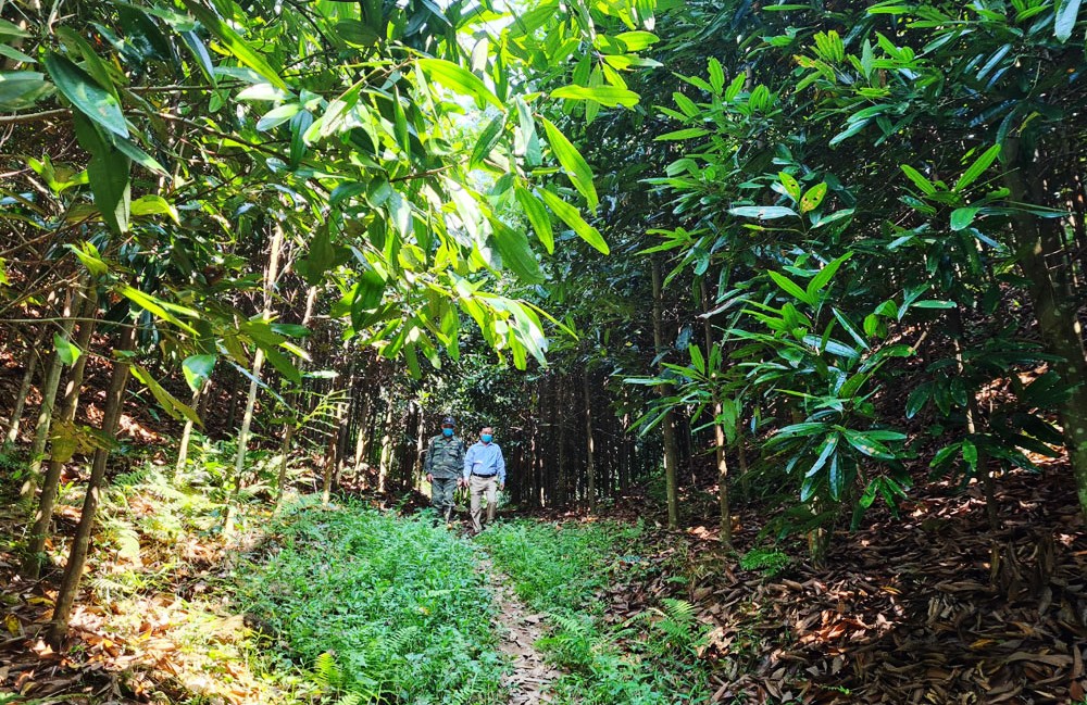 | Ông Bình kiểm tra diện tích quế của gia đình. |