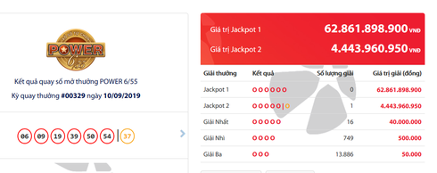 Tại kỳ quay số mở thưởng thứ 329 loại hình xổ số Power 6/55 diễn ra tối 10/9, Công ty Xổ số điện toán Việt Nam (Vietlott) đã không tìm ra người chơi trúng giải độc đắc Jackpot 1 trị giá hơn 62 tỷ đồng; nhưng đã tìm ra khách hàng may mắn trúng giải Jackpot 2 trị giá 4.443.960.950 đồng (chưa trừ thuế).