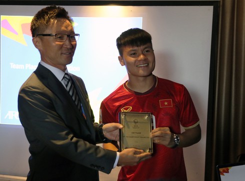 Đại diện AFC trao kỷ niệm chương tham dự VCK U23 châu Á 2020 cho đội trưởng Quang Hải. |
