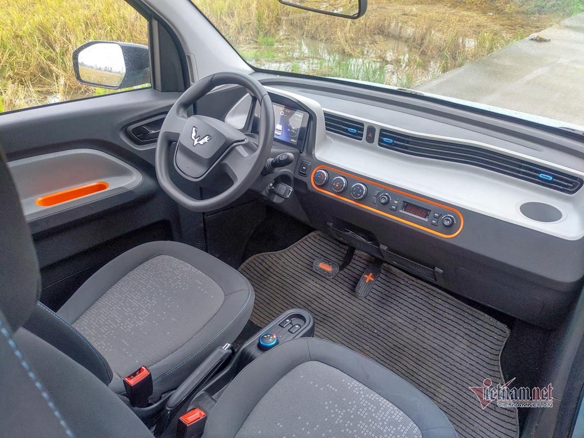 Bên trong, bệ trung tâm là điểm cộng cho chiếc mini EV này. Thiết kế dạng 2 tầng và uốn lượn kiểu vân sóng giúp người dùng có thêm chỗ để đồ và trông khoang lái cũng gọn gàng hơn. Hàng ghế đầu có thể dễ dàng di chuyển từ ghế lái sang ghế phụ mà không vướng bệ cần số.