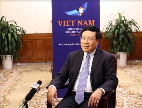 Phó Thủ tướng, Bộ trưởng Ngoại giao Phạm Bình Minh chia sẻ với báo giới nhân dịp Việt Nam được bầu làm ủy viên không thường trực Hội đồng Bảo an (HĐBA) LHQ nhiệm kỳ 2020-2021.