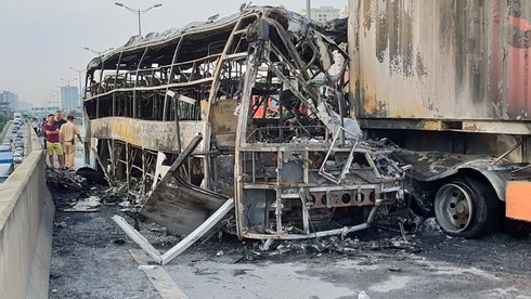 Va vào đuôi xe container, ô tô khách 47 chỗ cháy trơ khung trên đường Vành đai 3