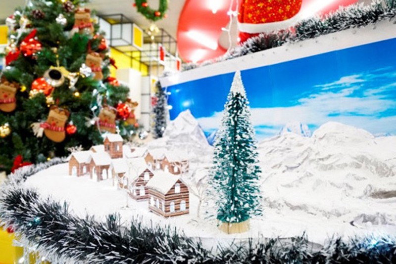 Khối Thương mại và Trung tâm Truyền thông Vietjet lại có cách trang trí tinh tế và gợi mở hơn bằng cây thông, tuyết trắng. |