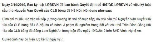 VFF xác định hành vi phạm lỗi của Văn Quyết là nghiêm trọng. Với án phạt này, mùa giải V.league (chỉ còn 2 vòng đấu nữa) năm nay coi như đã kết thúc với cầu thủ số 10 của Hà Nội.