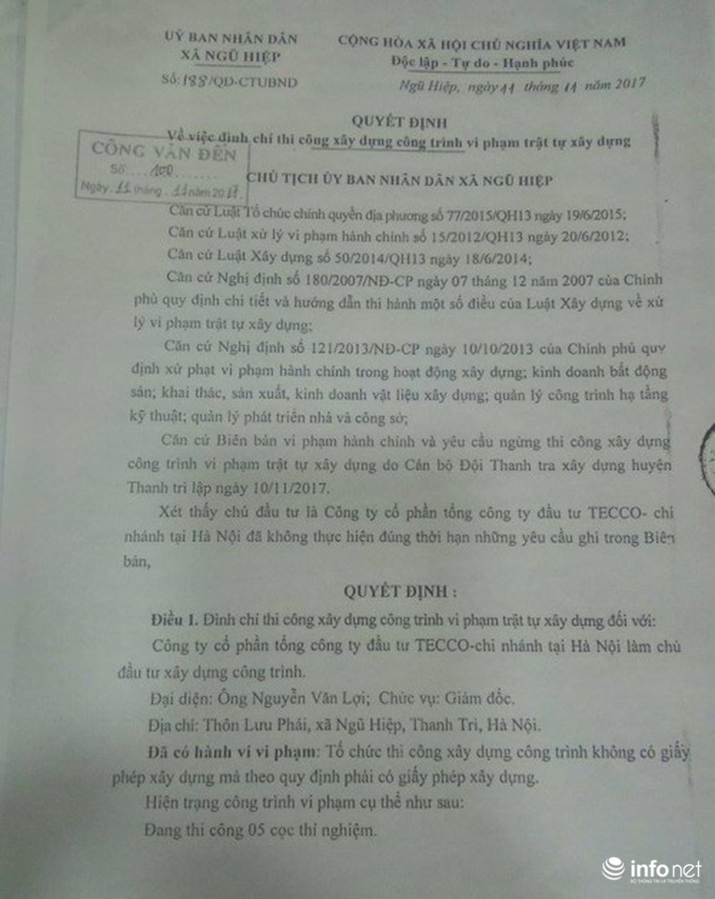 Tiếp đó, ngày 11/11/2017 UBND xã Ngũ Hiệp đã ra Quyết định 188/QĐ-CTUBND về việc đình chỉ thi công xây dựng công trình vi phạm trật tự xây dựng của Công ty CP Tổng Công ty Đầu tư Tecco - Chi nhánh Hà Nội.