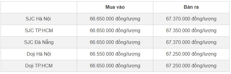 Còn kết phiên hôm nay, giá vàng miếng của Tập đoàn Vàng bạc đá quý Doji tại Hà Nội giảm 50 nghìn đồng/lượng ở chiều mua vào và giảm 100 nghìn đồng/lượng chiều bán ra; giá vàng miếng của Doji tại TP.HCM tăng 50 nghìn đồng/lượng ở cả chiều mua vào và bán ra so với chốt phiên giao dịch hôm qua.