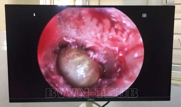 Qua thăm khám và nội soi tai mũi họng, các bác sĩ đã nhanh chóng phát hiện ở vị trí rìa màng nhĩ (tai phải) của bệnh nhi có hình ảnh dị vật màu xám đen và có máu cục. Làm sạch máu cục thì phát hiện dị vật là một loại ký sinh trùng – ve chó. Ngay lập tức trẻ đã được lấy bỏ dị vật ra ngoài.