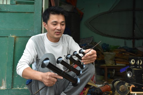 “Gỗ dùng để khoét miệng sáo tôi thường dùng gỗ mít hoặc sừng trâu. Nếu như gỗ mít với thời tiết nóng, ẩm không bị co giãn thì sừng trâu lúc buộc hoặc va chạm không bị vỡ nhưng giá thành cao hơn. Mỗi bên ống sáo có một miếng gỗ cách ngăn ở chính giữa.