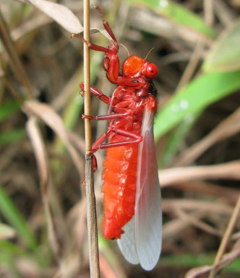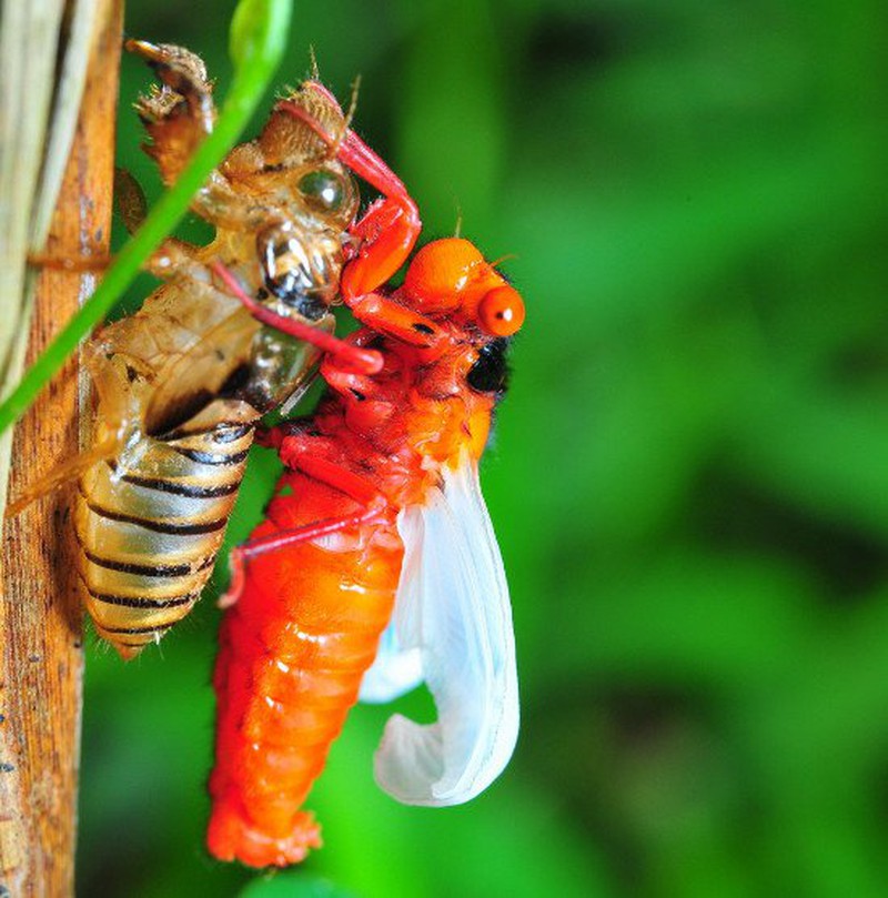 Không chỉ có phần thân đỏ rực như quả ớt, đôi cánh của loài ve này còn chuyển từ màu trắng muốt thành đen tuyền chỉ trong ít phút... |