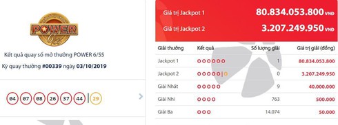 Qua xác định từ hệ thống kinh doanh xổ số tự chọn, Vietlott xác định có 1 vé trúng Jackpot 1 với giá trị giải là 80.834.053.800 đồng (chưa khấu trừ thuế thu nhập cá nhân theo quy định nhà nước) vào tối 3/10. Khách hàng đã tự tay chọn bộ số 04 – 07 – 08 – 26 – 37 – 44.