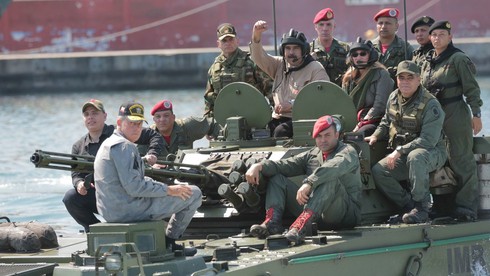 Tổng thống Nicolas Maduro trò chuyện với các binh sĩ Venezuela trên một chiếc xe tăng trong lúc đất nước đang hỗn loạn. |
