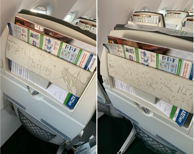 Mới đây nhất, vào ngày 20/12, trên tàu bay của một hãng hàng không ghi nhận hình ảnh ghế ngồi máy bay bị khắc, vẽ bậy nghiêm trọng. Cộng đồng mạng đã để lại nhiều bình luận thể hiện sự bất bình, ngán ngẩm vì hành vi xấu xí này.