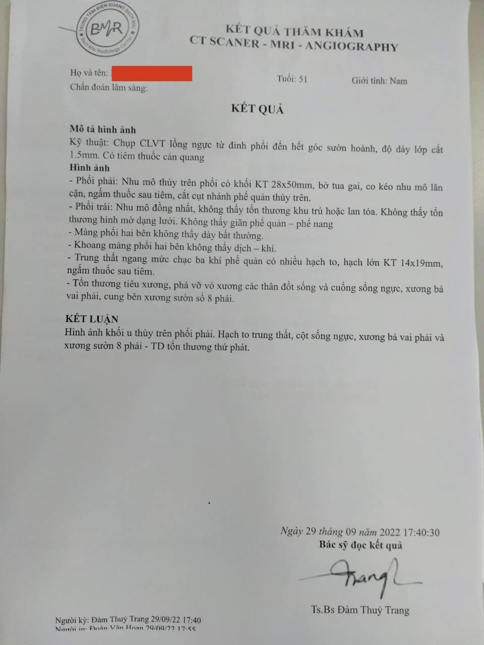 Trung tâm Y học hạt nhân và Ung bướu BV Bạch Mai vừa tiếp nhận một bệnh nhân nam (51 tuổi) đến khám vì đau xương bả vai. Kết quả CT có khối u thùy trên phổi phải, hạch to trung thất, tổn thương tiêu xương bả vai và xương sườn số 8 bên phải theo dõi tổn thương di căn.