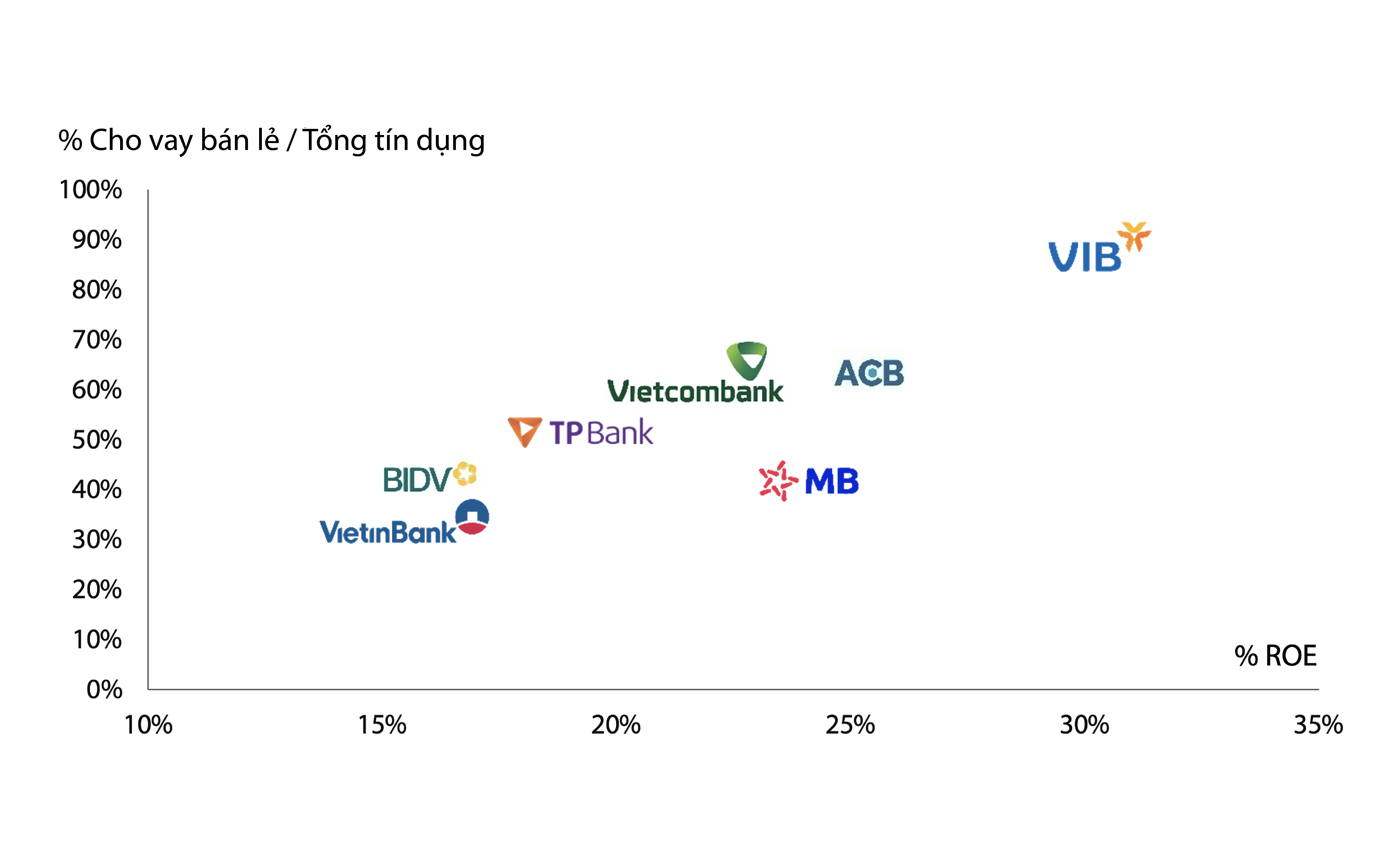 Biểu đồ: Tỷ trọng bán lẻ trên tổng dư nợ và ROE của các ngân hàng năm 2022. Nguồn: Fiinpro, Báo cáo tài chính các ngân hàng