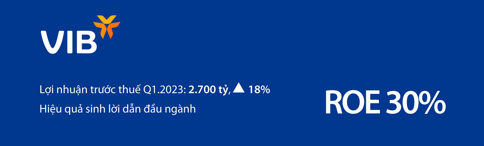 Kết thúc quý I, VIB ghi nhận lợi nhuận trước thuế đạt xấp xỉ 2.700 tỷ đồng, tăng 18% so với cùng kỳ. Trong đó, tổng thu nhập hoạt động đạt hơn 4.900 tỷ đồng, tăng trưởng hơn 19%. Ngân hàng duy trì biên lãi ròng (NIM) hiệu quả cao ở mức 4,6% trong bối cảnh cả lãi suất huy động và lãi suất cho vay có nhiều biến động. Chi phí hoạt động được kiểm soát tốt giúp hệ số chi phí hoạt động trên doanh thu (CIR) giảm xuống đáng kể, chỉ còn 32% trong quý 1.2023 so với 35% cùng kỳ năm trước. Nhờ đó, lợi nhuận trước dự phòng của ngân hàng đạt hơn 3.360 tỷ đồng, tăng 26% so với quý 1/2022.