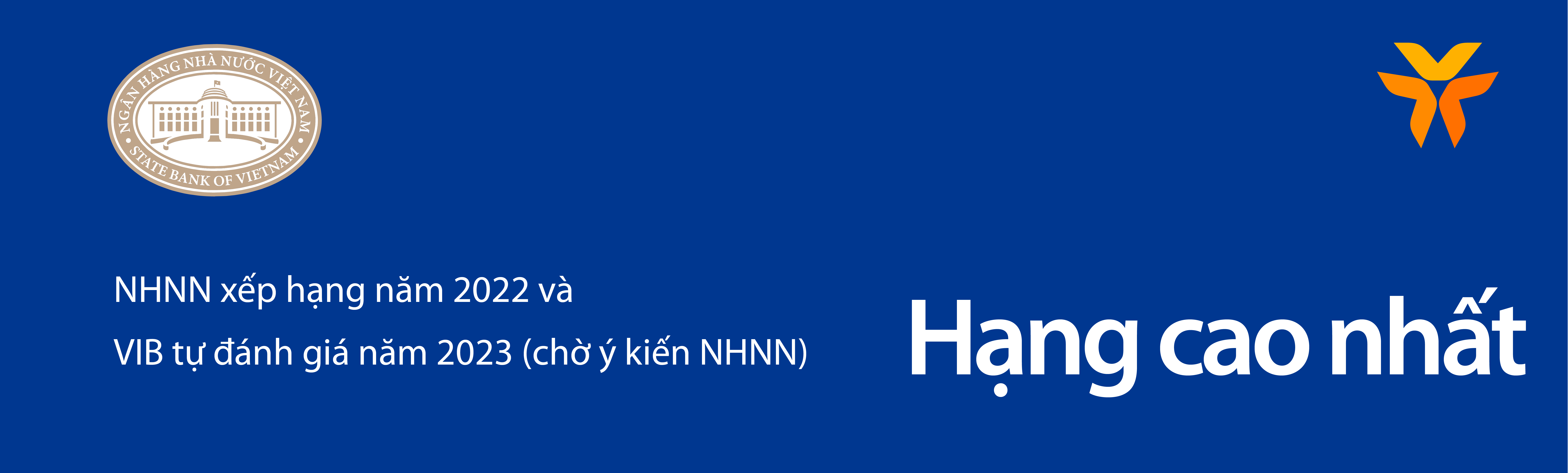 Về xếp hạng bởi Ngân hàng nhà nước (NHNN): Trong năm 2022, VIB nhận được kết quả do Ngân hàng Nhà nước xếp hạng ở nhóm cao nhất ngành. Với hiệu quả kinh doanh cao, an toàn về cả mặt định lượng và định tính, VIB đã sử dụng phương pháp luận do NHNN ban hành để tự đánh giá, kết quả tiếp tục duy trì ở thứ hạng cao nhất (kết quả chính thức sẽ do NHNN công bố trong năm 2023).