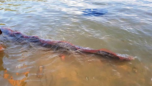 Video: Cá hố rồng dài 3m, bơi lội trước cổng đền Lê Khôi trước ngày giỗ