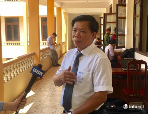 Luật sư Lê Văn Thiệp trao đổi với báo chí bên ngoài phòng xử. |