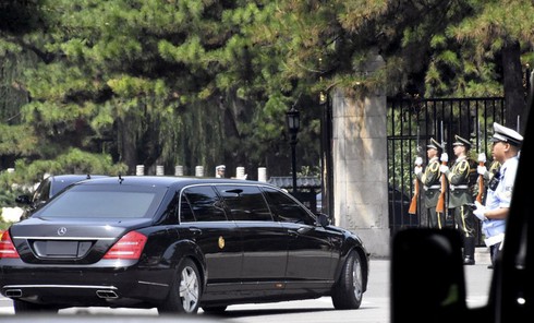Chiếc xe được cho chởNhà lãnh đạo Triều Tiên Kim Jong-un tiến vàonhà khách quốc gia Điếu Ngư Đài tại thủ đô Bắc Kinh của Trung Quốc vào hôm nay (19/6). |