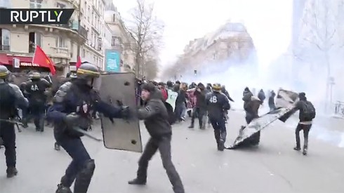 Người biểu tình và cảnh sát Pháp đụng độ. |