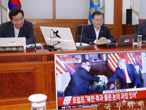 Tổng thống Hàn Quốc Moon Jae-in theo dõi diễn biến của cuộc gặp mặt Trump - Kim. |
