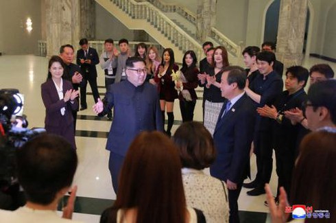 Nhà lãnh đạo Triều Tiên Kim Jong-un giao lưu cùng các nghệ sĩ Hàn Quốc tại Bình Nhưỡng. |