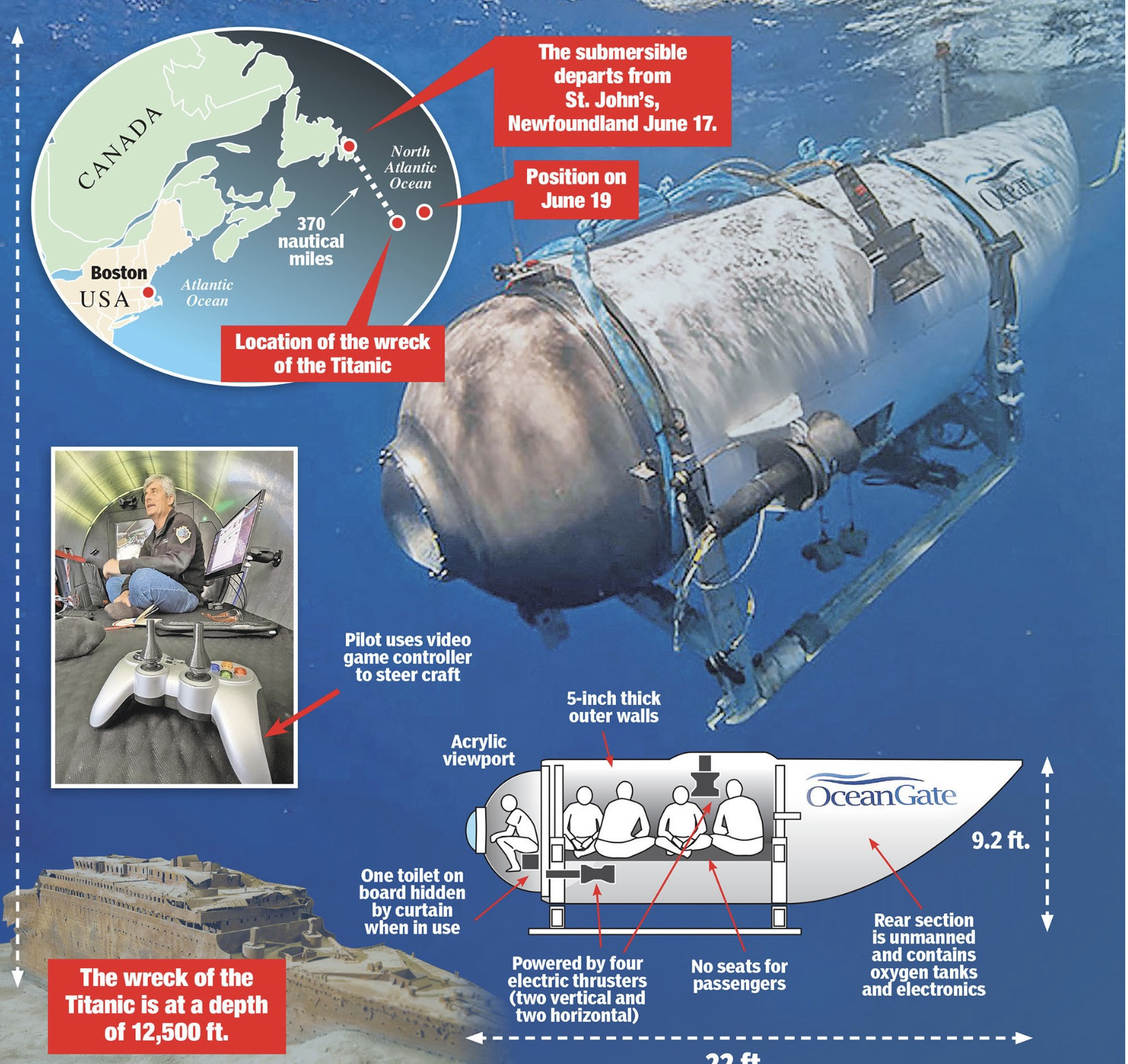 Theo hãng tin BBC và NewYork Post dẫn lời Chuẩn Đô đốc Mỹ John Mauger, tàu lặn Titan đã bị nghiền nát vì áp suất ở độ sâu vài nghìn mét dưới mặt biển. Sức ép ở độ sâu đáy biển trong trường hợp này là 4.000 tấn/m2. Các mảnh vỡ từ tàu lặn đều bị biến dạng, cho thấy phương tiện này bị vặn bẹp toàn bộ.