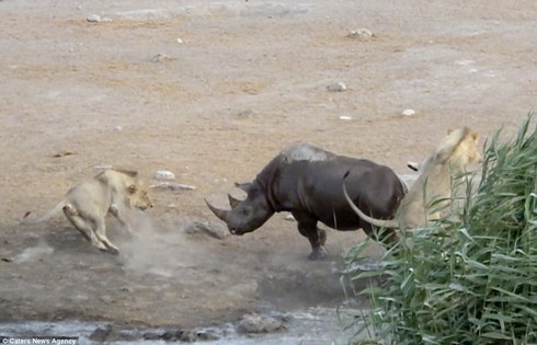 Chờ lúc tê giác mẹ bất cẩn, sư tử bất ngờ lao ra tấn công tê giác con. Nhưng may mắn tê giác mẹ đã phát hiện và quay lại đuổi sư tử.