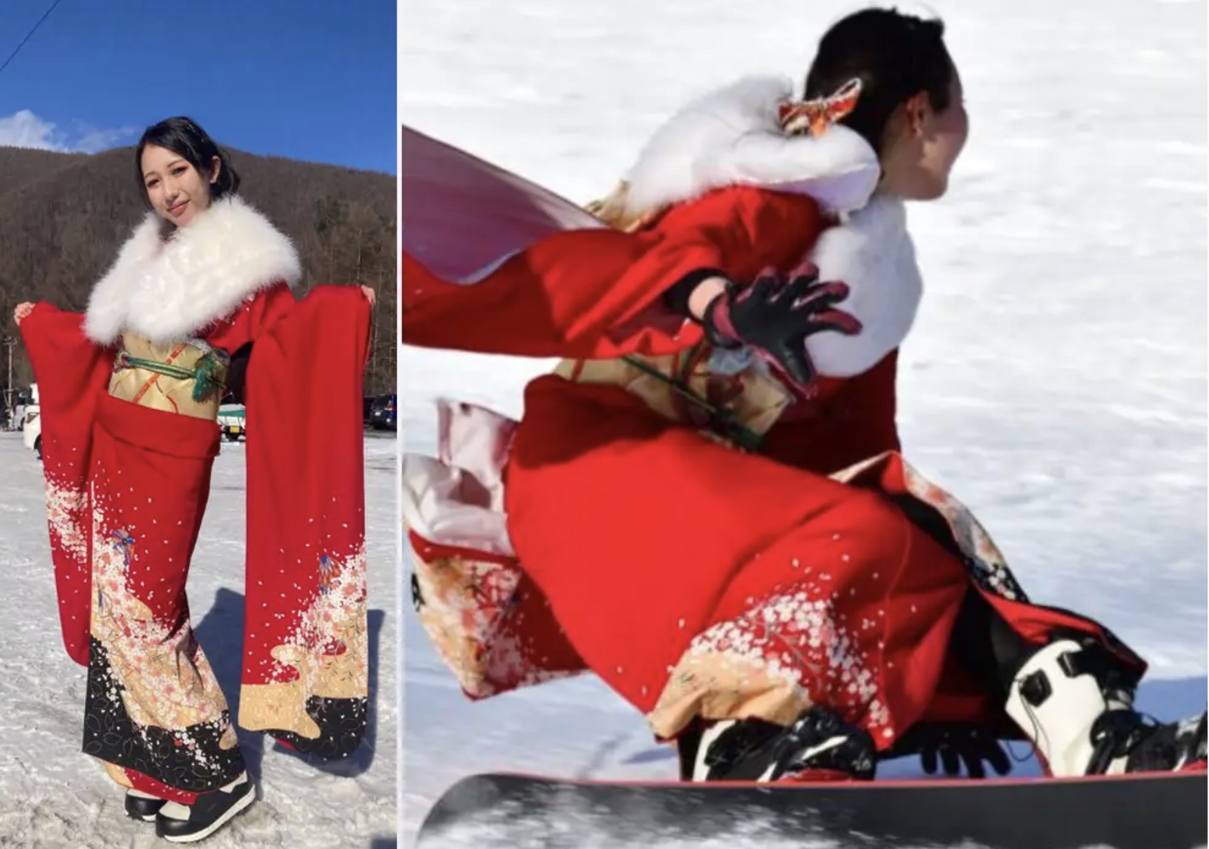 Video thiếu nữ diện kimono đỏ 'bay' trên tuyết trắng gây sốt