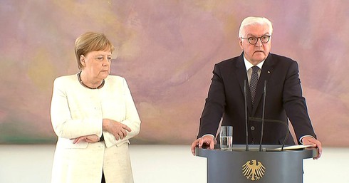 Video: Thủ tướng Đức Merkel lại run lẩy bẩy khi nghe Tổng thống phát biểu