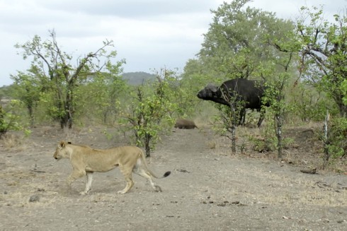 Theo tờ Daily mail, con trâu mẹ một mình chống lại 14 con sư tử bể bảo vệ xác con trong vườn quốc gia Krugersdrop, Nam Phi.