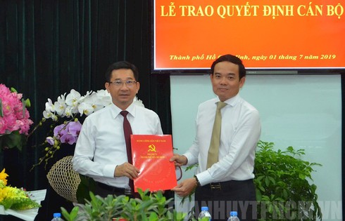 Ông Trần Lưu Quang (phải) trao quyết định cho ông Dương Ngọc Hải. (Ảnh: Thành ủy TP.HCM) |