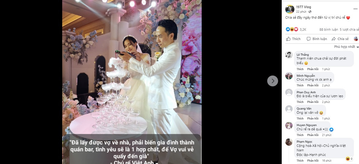 Mặc dù cặp đôi không chia sẻ quá nhiều hình ảnh lên mạng xã hội nhưng cư dân mạng có thể dễ dàng nhận thấy, đám cưới của anh chàng Việt Anh được tổ chức ấm cúng tại gia đình và chắc chắn không thể thiếu những pha lầy lội, hài hước của anh em nhà 1977 Vlog .