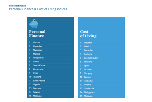 Theo bảng xếp hạng năm 2017, Việt Nam trở thành quốc gia dẫn đầu trong chỉ số Tài chính cá nhân, sau khi chỉ đứng thứ 5 trong năm 2016. Gần ba trong số 10 người trả lời (28%) hoàn toàn hài lòng với tình hình tài chính của họ khi sống ở Việt Nam, cao hơn mức trung bình toàn cầu (17%) đến 11 điểm phần trăm.