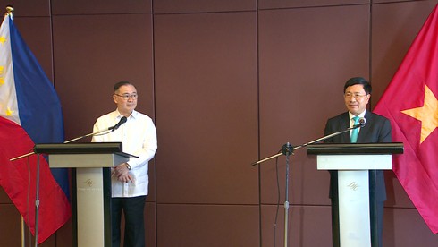 Phó Thủ tướng, Bộ trưởng Phạm Bình Minh và Bộ trưởng Teodoro Lopez Locsin họp báo. |