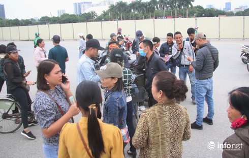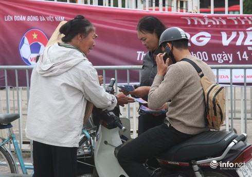 Rất nhiều cò vé đã lao ra đường mời chào khách, bất chấp thời tiết mưa phùn của Hà Nội. Càng sát giờ thi đấu, thị trường vé chợ đen ở cổng SVĐ Mỹ Đình càng hoạt động náo nhiệt.