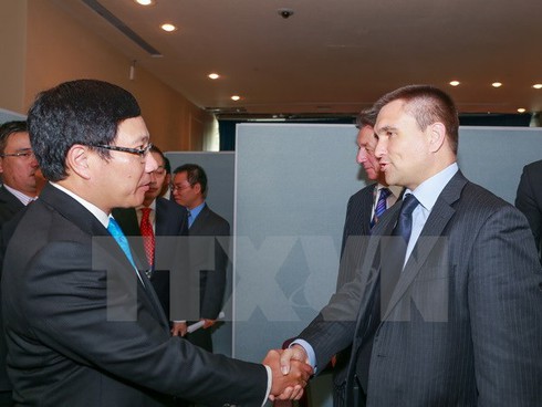 Phó Thủ tướng, Bộ trưởng Ngoại giao Phạm Bình Minh và Bộ trưởng Ngoại giao Ukraine Pavlo Klimkin bày tỏ mong muốn tiếp tục củng cố và tăng cường quan hệ chính trị tốt đẹp giữa hai nước. Hai bên nhất trí cần đẩy mạnh trao đổi đoàn các cấp, đặc biệt là cấp cao, tiếp tục phối hợp chặt chẽ tại các diễn đàn đa phương.