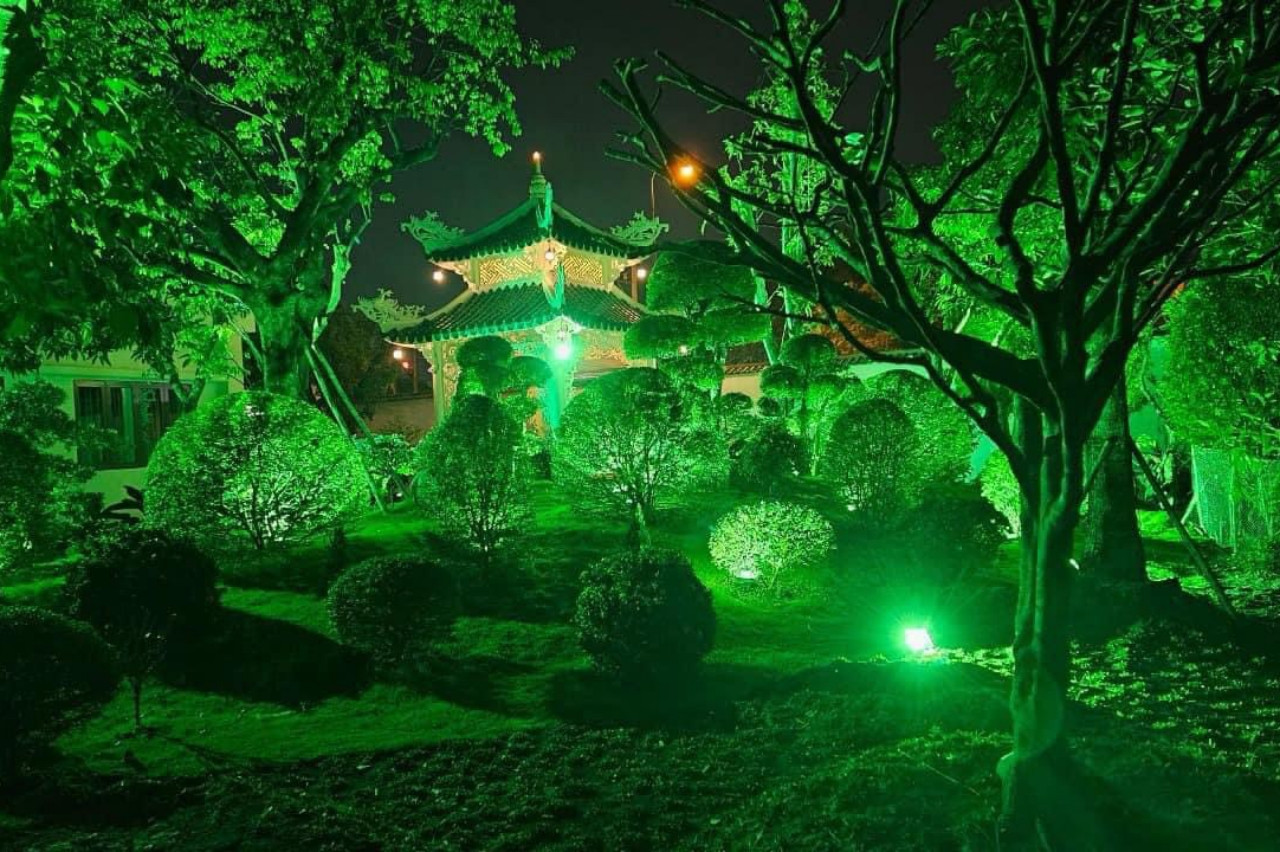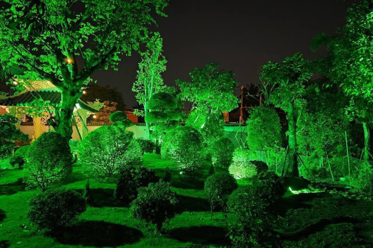 Khu vườn ấn tượng với nhiều cây xanh được cắt tỉa có dáng bonsai đẹp mắt. Việt Trinh cho người chăm chút tỉ mỉ, gắn đèn led tạo hiệu ứng. Về đêm, nhiều người xuýt xoa khen nơi này như chốn bồng lai tiên cảnh.