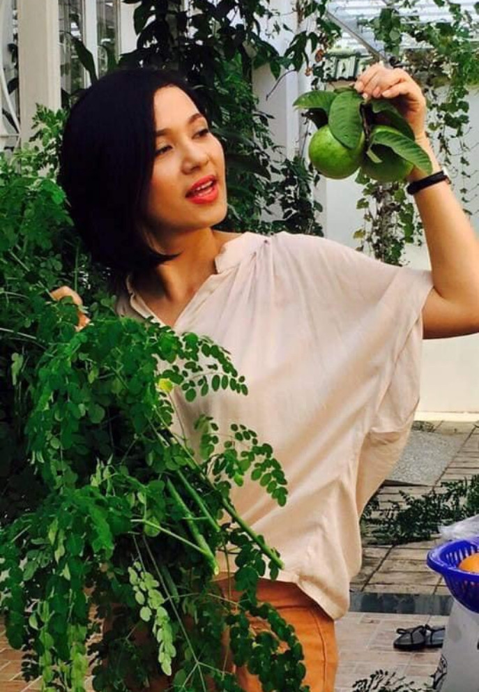 Việt Trinh đùa khi chăm sóc vườn rau, chị giống như người nông dân thực sự và các bữa ăn không phải tốn tiền mua rau hay trái cây vì tất cả đều sẵn.