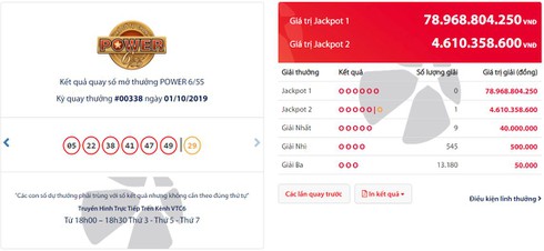 Tại kỳ quay mở thưởng số 338 sản phẩm Power 6/55 tối 1/10, Công ty Xổ số điện toán Việt Nam (Vietlott) xác định có 1 vé trúng thưởng Jackpot với giá trị giải thưởng hơn 4,6 tỷ đồng được phát hành tại Đà Nẵng.