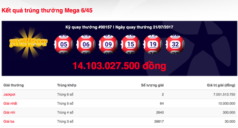 Theo đó, dãy số may mắn của lần quay số này là 05-06-09-15-19-32, giá trị giải thưởng được cộng dồn lên đến 14,1 tỷ đồng. Có hai chiếc vé trúng giải và đây cũng là giải độc đắc có giá trị thấp nhất kể từ khi loại hình xổ số điện toán hoạt động cho đến nay.