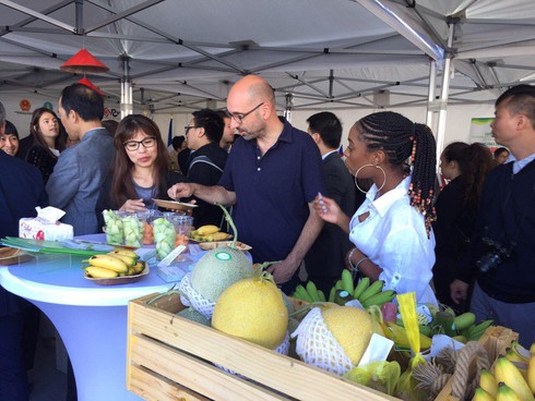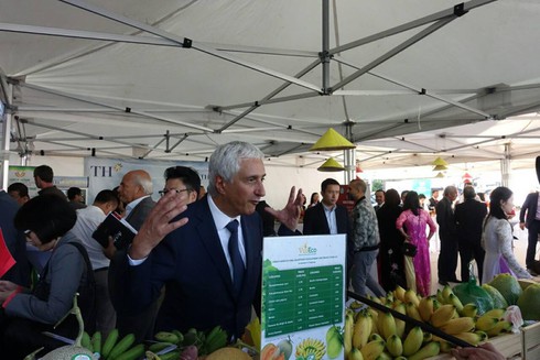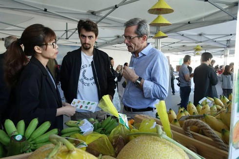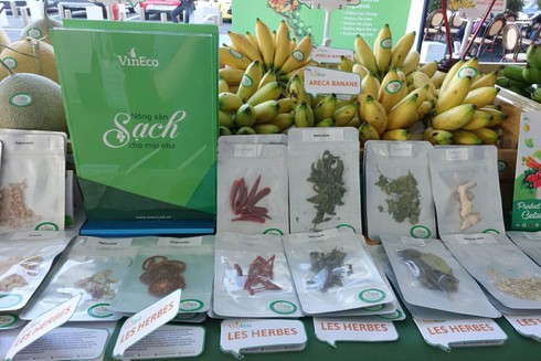 Đến với hội chợ Nông sản Rungis cùng hơn 30 doanh nghiệp Việt, các gian hàng của Công ty VinEco gây ấn tượng bởi màu xanh đặc trưng cùng các loại sản phẩm nhiệt đới như: dưa lê, bưởi, chuối cùng các loại gia vị…