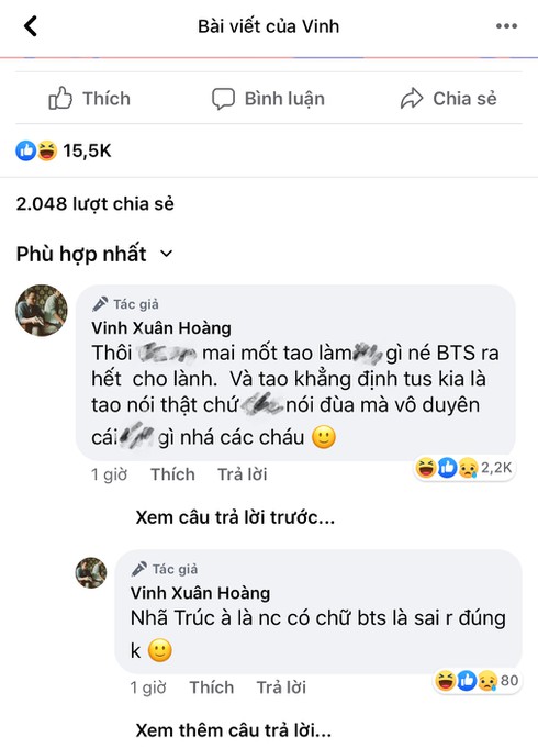 Hiện tại vụ việc này vẫn đang gây tranh cãi trên trang cá nhân của Vinh Râu mà chưa có hồi kết.